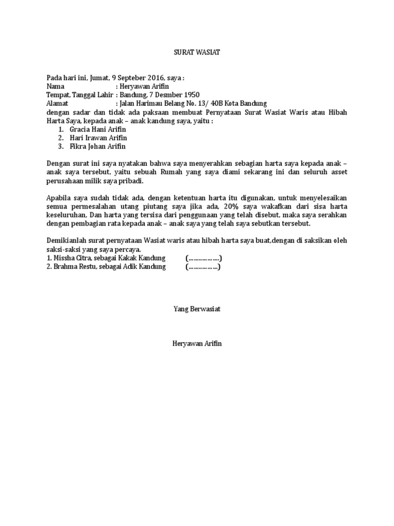 Pembahagian Harta Pusaka Contoh Surat Wasiat Sendiri Nusagates. Contoh Format Surat Hibah Wasiat 15 contoh surat hibah tanah rumah benda dll paling lengkap seiring dengan perkembangan zaman dan kecanggihan teknologi sekarang ini maka penggunaan surat sebagai media komunikasi juga sudah semakin berkurang. Download Contoh Surat Wasiat Untuk Berbagai Keperluan RomaDecade Format 579 x 750 pixel.