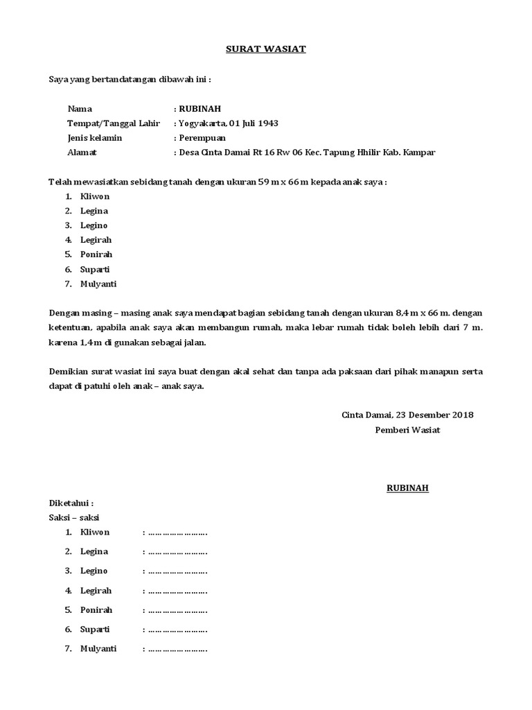 Surat Peryataan Penyerahan Tanah Oleh Ahli Waris. Contoh Surat Wasiat Baru have an image from the otherContoh Surat Wasiat Baru It also will feature a picture of a kind that might be observed in the gallery of Contoh Surat Wasiat Baru. This article discusses the principal rules which apply to the Muslim Will Wasiat.